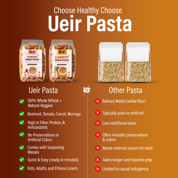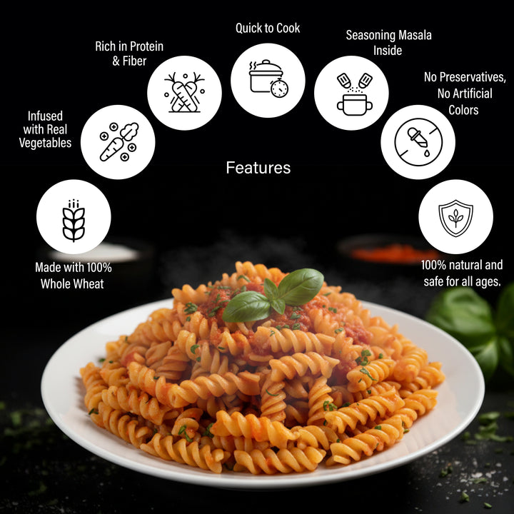 Tomato Wheat Pasta: Savor the rich, tangy flavor of our Tomato Wheat Pasta. Made with the natural goodness of ripe tomatoes blended with whole wheat, this pasta is high in antioxidants like lycopene, making it a flavorful and nutritious choice for your everyday meals.