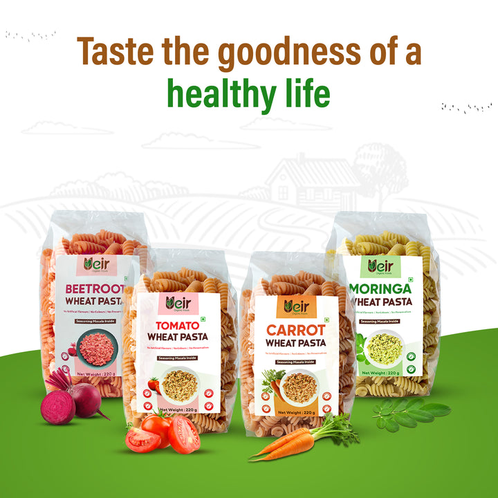 Beetroot Wheat Pasta: Add a splash of color and nutrition to your meals with our Beetroot Wheat Pasta. This hearty pasta combines the earthy sweetness of beets with whole wheat to create a nutrient-dense option, loaded with antioxidants and minerals that promote heart health.